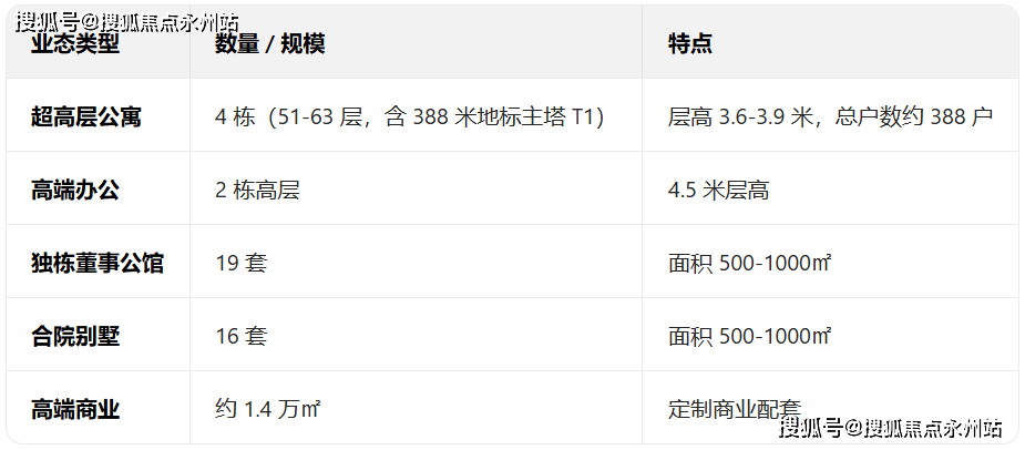 超高层公寓:4栋51-63层超高层,含388米地标主塔T1,总户数约300户,主打大平层产品,层高3.6-3.9米,远超普通豪宅标准。